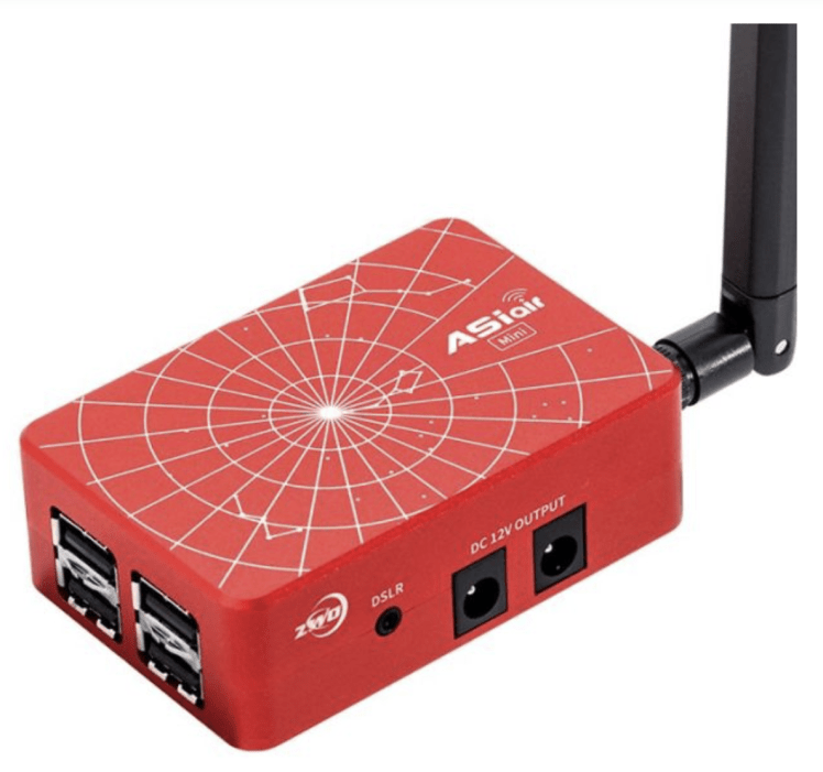 The ASIAIR Mini Wi-Fi Astrophotography Control Hub from ZWO has ports for plugging in control and power cables for your camera, mount, motorized focuser, electronic filter wheel, and dew heater. With the ASIAIR app for iOS or Android, you can control each component of your rig through the ASIAIR Mini via Wi-Fi. Tthe ASIAIR app lets you plan and launch fully automated imaging sessions. It requires a 12V 5A power supply to operate the hub.