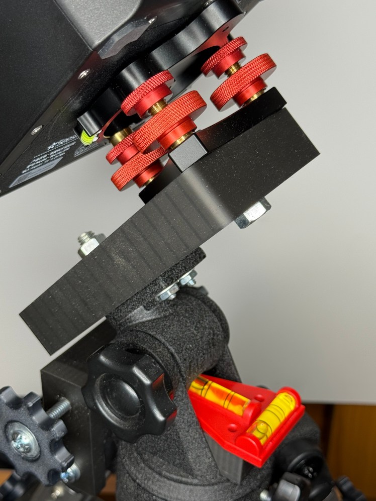 For fine altitude adjustment, a tripod leveler was attached between the S50 and the adapter plate. once the local latitude was set roughly, the S50 polar align routine was completed using the leveler plate. Only the adjuster in line with the RA axis was used.